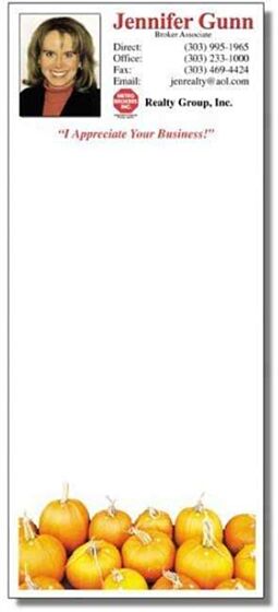 Our Customizable Pumpkins Notepads are the perfect gift – add your branding, headshot, and contact information to entice recipients to call or email whenever they need your assistance. The cute pumpkin design adds that special autumnal touch too.