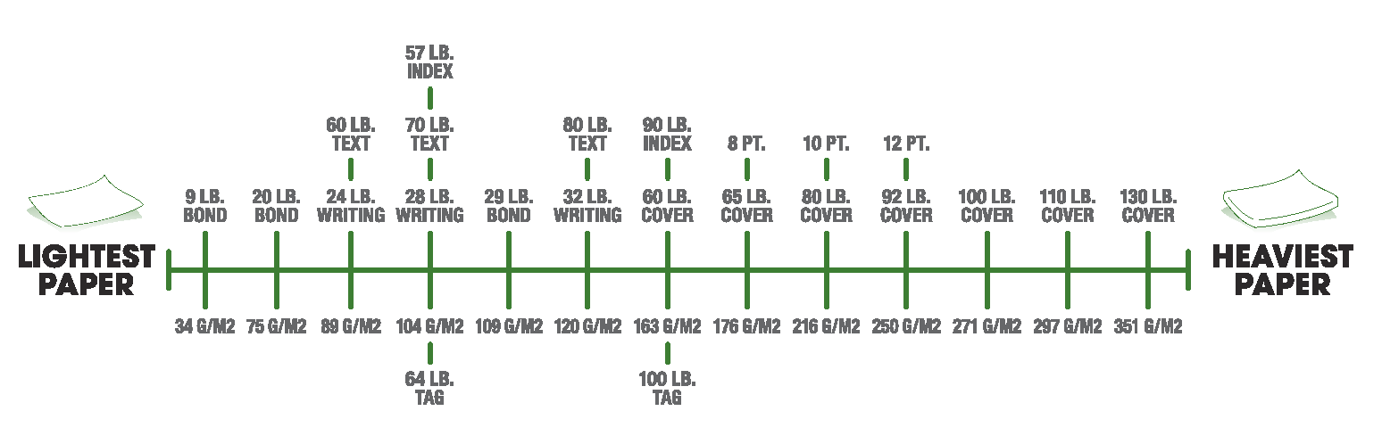 The paper used for writing/printing (notepads, letterheads and stationery) is Offset Text paper, and is generally between 50 to 100 lbs. (equivalent to 20 to 70 lb. Bond). In the European system, this is typically 60 to 120 gsm. Anything heavier than this is considered the card stock, i.e. the paper used for business cards, postcards, greeting cards, journal covers, etc.